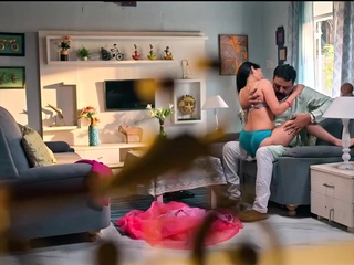 Busty curly brunette with big boobs fucks on couch
