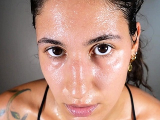 Small titted brunette Sharron with glasses masturbates