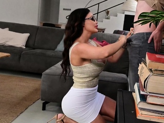 Busty curly brunette with big boobs fucks on couch