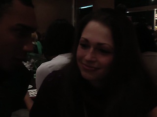She drops to her knees and sucks two big cocks before getting pounded doggy style